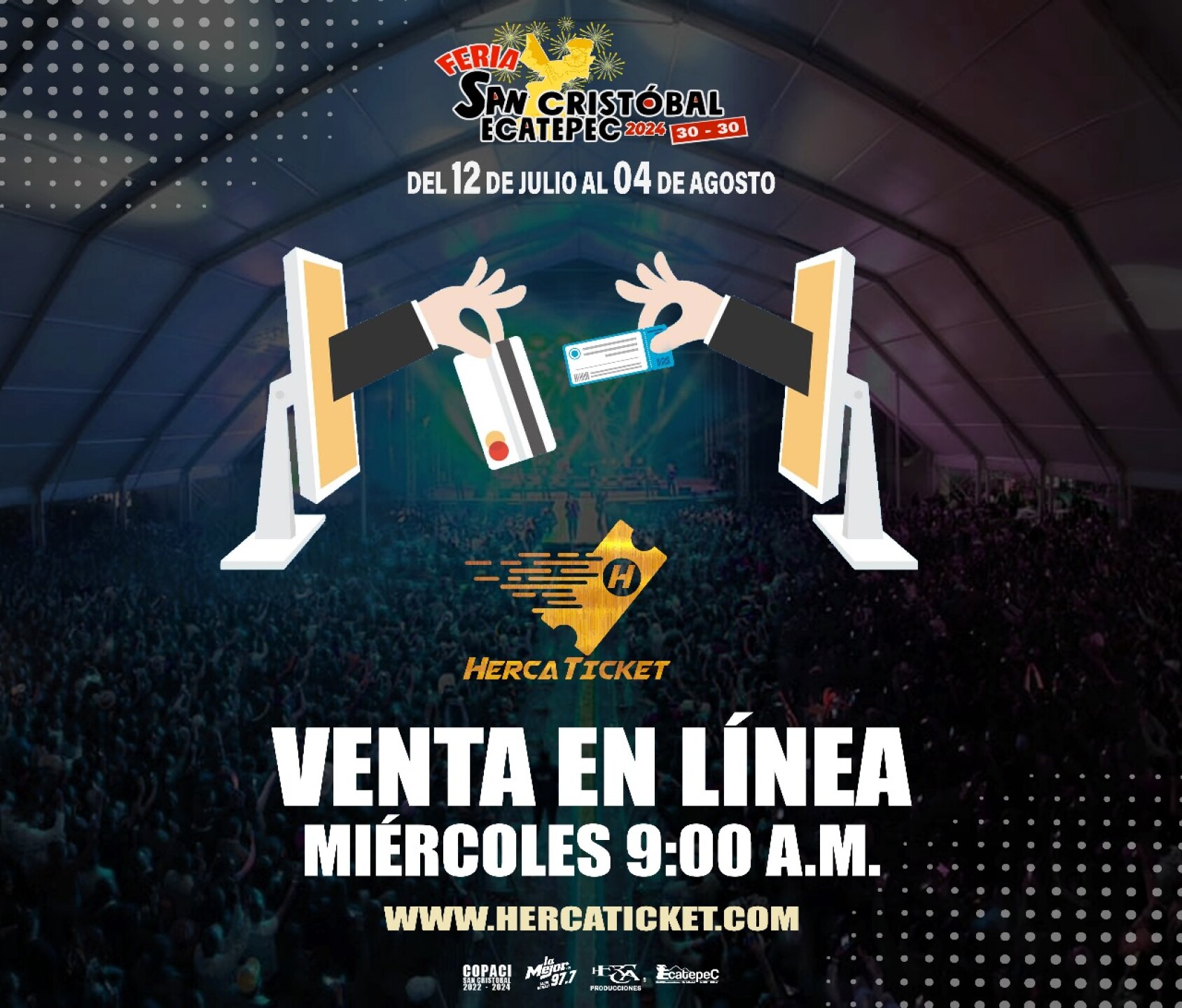 La preventa de boletos en línea comienza este miércoles 3 de julio a las 9:00 horas través de www.hercaticket.com, mientras que de manera física la venta estará disponible en el Centro Cívico de Ecatepec y directamente en las taquillas de la Feria de San Cristóbal Ecatepec 2024.