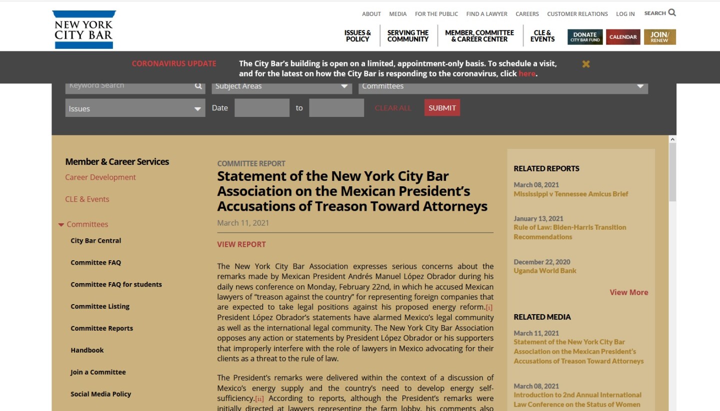 Barra de Abogados de NY advierte que los comentarios del presidente contra los abogados mexicanos que representen multinacionales, son un ataque directo al estado de derecho
