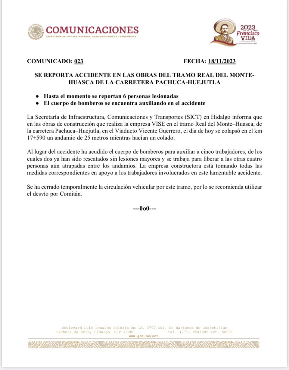 “Las obras de construcción que realiza la empresa VISE en el tramo Real del Monte-Huasca, de la carretera Pachuca-Huejutla, en el Viaducto Vicente Guerrero, el día de hoy se colapsó... mientras hacían un colado”, escribió la dependencia en un comunicado difundido en su cuenta de X, antes Twitter.