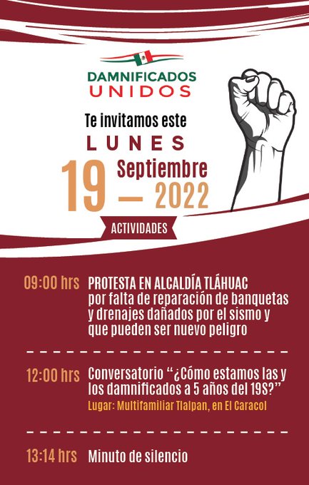 Por lo pronto, para no olvidar y porque la lucha de los damnificados no ha terminado, el próximo domingo 18 los vecinos del Multifamiliar Tlalpan realizarán dos eventos en memoria de las víctimas de ese inmueble; el lunes 19 habrá un conversatorio en esa misma sede para evaluar la situación de los damnificados a cinco años del terremoto y una protesta en Tláhuac por daños no reparados que representan riesgo.
