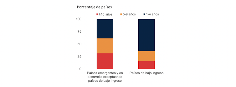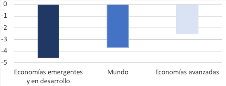 Además, se ha producido una caída de la renta per cápita en más del 90 % de los países en desarrollo. La mitad de estas economías revertirá los avances de los últimos cinco años o más y una cuarta parte perderá todo el progreso realizado desde 2010.